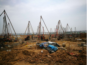 該項目場地內分布有3個大魚塘,淤泥層厚;地形變化大,高低不平;白云巖差異風化嚴重,鉆進難度大。針對項目工作量大、工期緊,鉆進難度大,場地條件差的特點,我公司中標后,在3天內組織安排技術管理人員4名、35臺鉆探設備進場作業(yè)。
