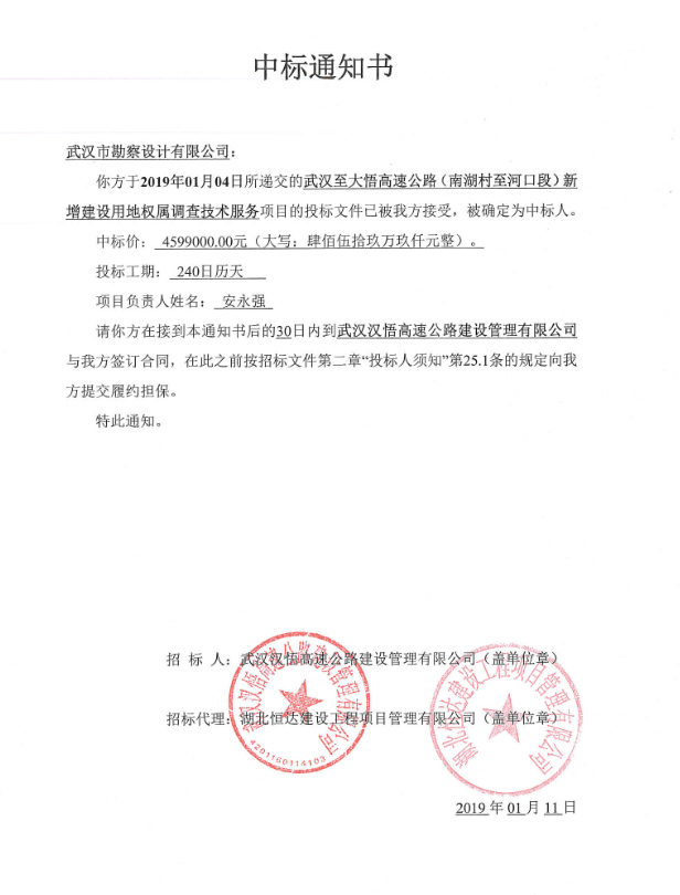 2019年1月11日,中國招投標公共服務(wù)平臺發(fā)布公告,我司成功中標武漢至大悟高速公路(南湖村至河口段)新增建設(shè)用地權(quán)屬調(diào)查技術(shù)服務(wù)項目,中標價格為459.9萬元,該項目建設(shè)單位為武漢漢悟高速公路建設(shè)管理有限公司。