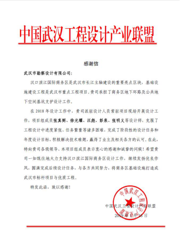 2019年1月21日,中國武漢設計產(chǎn)業(yè)聯(lián)盟向我司發(fā)來感謝信,對漢口濱江國際商務區(qū)基坑支護設計項目組成員一年來辛勤而卓有成效的工作表示感謝,這封感謝信代表了設計產(chǎn)業(yè)聯(lián)盟對我司設計工作的充分認可。